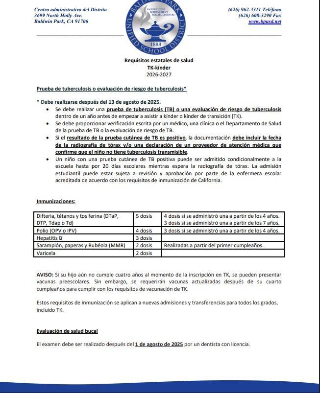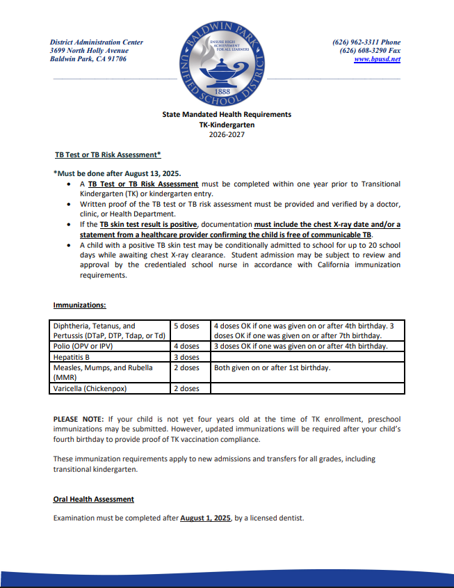 New TB Requirements for Incoming TK/Kindergarten Students!